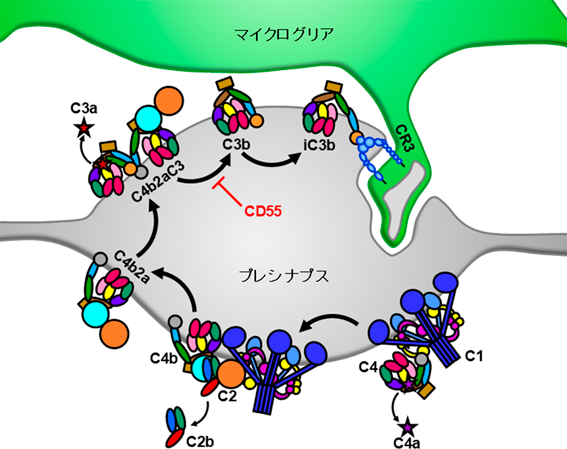 C1qを起点とする古典的補体活性化経路が、マイクログリアによるシナプス貪食を誘導するまでのシグナル伝達。マイクログリアはCR3を構成するインテグリンCD11bを介してiC3bを認識し、シナプスを貪食する。図は文献10より改変。