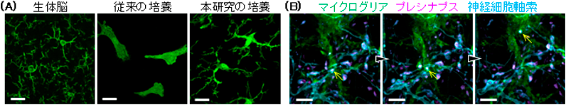 我々は、マイクログリアが生きた神経細胞からシナプスのみを選択的に貪食する証拠をつかむべく、高い時空間解像度でマイクログリアによるシナプス貪食を観察する培養系を構築した。従来、培養下のマイクログリアではその特徴である細長く分岐した多数の突起が失われることが問題となっていた。そこで、培養条件(培地組成や培養日数など)を検討し、この問題点を克服した(図2(A))。そして、トランスジェニックマウスおよびアデノ随伴ウィルスの利用により、マイクログリア(CX3CR1-GFP/+マウス)、シナプス小胞マーカー(Synaptophysin-mCherry)、神経細胞軸索膜(membrane-targeted iRFP)を可視化した。タイムラプスイメージングの結果、マイクログリアの微小突起が軸索と接続されたプレシナプス構造に向かって伸展し、プレシナプス構造を選択的に取り込む過程を捉えることに初めて成功した(図2(B))。また、シナプス貪食前後において、神経細胞軸索の構造が保持されていることを発見した。さらに、取り込まれたシナプス成分がマイクログリア内のリソソームに移行する様子も明瞭に示し、これは単なる構造の接触やトロゴサイトーシスの仮説にとどまらず、実際にマイクログリアがシナプスタンパク質を分解している証拠となった19)。