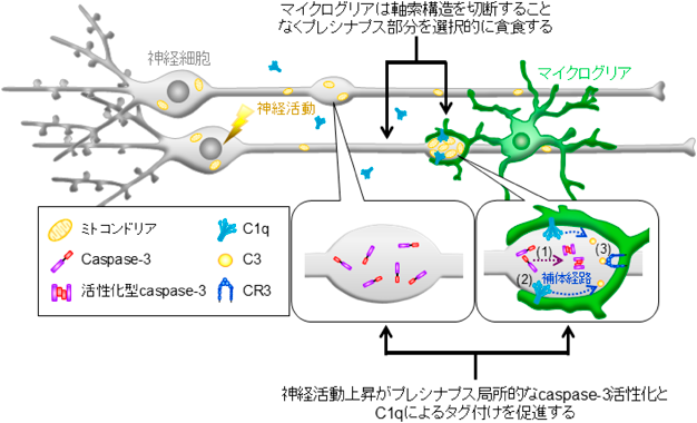 では、このシナプス選択的な貪食を可能にする分子メカニズムは何だろうか。筆者らは、神経細胞の局所で生じるcaspase-3活性化に着目した。caspase-3は細胞死の一種であるアポトーシスの実行因子であるが、神経細胞のあるコンパートメントに限局して一過的に活性化された場合には、アポトーシスではなくそれらのコンパートメントの形態的、機能的成熟を促進することが報告されている23)。また近年、シナプトソーム解析によって、活性化型caspase-3が含まれるプレシナプス画分にはC1qも多く含まれることが示唆された24)。しかしながら、プレシナプス局所的なcaspase-3活性化のトリガーや、マイクログリアによるシナプス貪食との関連性は不明であった。