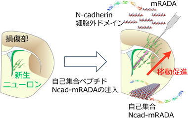 脳損傷の治療法を開発する上で、足場細胞を模倣した人工足場バイオマテリアルを損傷部に移植することが考えられる。これまでに脳表層部の損傷において、新生ニューロンは移植したN-cadherin10)やLaminin14)を含むゼラチンスポンジを移動の足場とすることが明らかになった10)。しかし、スポンジ材料は脳深部の傷害に対しては侵襲性が大きく適応が困難であった。そこで今回、筆者らは注入型ペプチド材料を活用した15)。ペプチド材料mRADAは生体内条件下で自己集合して繊維状のハイドロゲルを形成する。mRADAは脳深部に注入でき、従来のスポンジ材料と比べて侵襲性が少ない他、極性を持った放射状グリア細胞を模してV-SVZから脳表層まで連なった足場を作成することが可能となった。さらに、自己集合性ペプチドmRADAにN-cadherinの細胞外ドメインを組み込むこみ、放射状グリア細胞の形状と発現分子を模倣したNcad-mRADAを開発した。新生仔大脳皮質傷害モデルマウスにおいて新生ニューロンはNcad-mRADAを足場として、脳室下帯から離れた損傷部位まで移動し、再生した成熟ニューロンが損傷領域において増加した(図2)。さらに、新生仔マウスでは歩行機能も回復し、注入型ペプチド材料Ncad-mRADAによる治療効果を示した。また、ハイドロゲルは生体内において分解されることを確認し、再生医療に活用が可能と考えられた。成体脳梗塞モデルマウスにおいてもmRADA注入群と比較してNcad-mRADA注入群は、産生した新生ニューロンが有意に多くかつ遠くまでペプチド材料の足場に沿って移動できた。放射状グリア細胞は本来、出生直後で消失することから、Ncad-mRADAが成体マウス脳において足場として有用であるか不明であった。しかし、今回の結果から成体マウスの新生ニューロンは発生過程や生後直後の新生ニューロンの特性を維持しており、接着分子を組み込んだ足場材料と相互作用することが示された15)。本マテリアルはこれまでニューロンの移動と再生が困難であった脳深部においてもアプローチを可能とし、さまざまな分子を組み込めることから、適用範囲が広く有望なバイオマテリアルである。