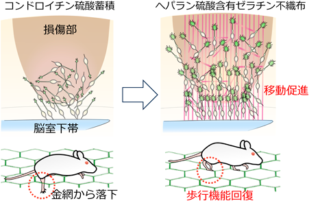 筆者は、新生仔大脳皮質傷害モデルマウスを用いて、CSPGが蓄積する損傷部位に、リコンビナントHSPGを含むゼラチン不織布を移植した。培養条件下において新生ニューロンの移動促進効果を確認できたリコンビナントHSPGの中から、グリピカン4(GPC4)、シンデカン2(SDC2)、およびシンデカン4(SDC4)を選択して、脳傷害モデルマウスの実験に用いた。傷害脳において、新生ニューロンの成長円錐はいずれのHSPGを含むゼラチン繊維に接触すると伸展し、ニューロン移動が促進することをスライス培養から明らかにした。新生ニューロンはHSPG含有ゼラチン不織布を移植すると1週間後には大脳皮質の下層から上層まで広く分布した。移植1ヶ月後の大脳皮質では、HSPG含有群においては再生した成熟ニューロンの数が増加し、さらにマウスの歩行機能も改善した(図3)。遺伝学的手法を用いて、生後に産生した新生ニューロンを除去すると、HSPG含有群で歩行機能の改善効果が消失したことから、新生ニューロンが神経機能改善を担っていたと考えられる。また、HSPG含有ゼラチン不織布の繊維が脳梁に沿うように損傷部に移植して、脳表面に向かって伸びる繊維を少なくすると、大脳皮質の表層部に到達する新生ニューロンの数が減少した。そして、HSPGを付加したポリプロピレン不織布を移植した場合、移動した新生ニューロンは主に第5–6層に観察され、分布が狭い範囲に限定された。以上から、新生ニューロンの移動が抑制されるCSPGが蓄積する環境下においても、適切な人工足場に含ませたHSPGによって新生ニューロンの成長円錐を制御することで、抑制を解除することが可能となることを見出した13)。本研究から、脳損傷後の神経機能改善における新生ニューロンの有用性ならびに、バイオマテリアルの選択の重要性が明らかになった。生後に限らず、胎生期の新生ニューロンの成長円錐もPTPσを発現することから13)、発生初期からの脳形成においてもプロテオグリカンの関与が示唆され、脳形成障害における治療介入法の開発に本研究の有効性が考えられる。