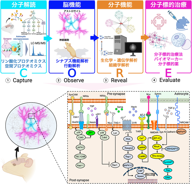 ギリシャ語で「接続」を意味するシナプスは神経細胞間の情報交換を担う主要接触部位であり、生涯にわたる形成・再編・除去の循環によって記憶・学習・情動などの高次機能を支える動的構造である。近年、アストロサイトが三者間シナプス(トリパーティト・シナプス)を構成し、発達期の配線から成体脳の可塑性、興奮/抑制バランス、代謝供給、さらにはシナプス除去に至るまで、近接するシナプスの形成と機能を積極的に統御することが明らかとなった。各シナプスは数千種のタンパク質から成り、その時空間的発現とダイナミクスが小胞放出、受容体リモデリング、接着複合体の再編、シナプス強度の調整を司る。一般意味論を提唱したコージブスキーの「地図は領土ではない」に倣えば、同一の遺伝子セットを共有する細胞型であっても、発達段階・回路文脈・行動状態・疾患病態に応じて、実際に機能するタンパク質の種類・量・役割は大きく変動する。すなわち、個々のシナプスは分子構成と機能の両面で特異化した単位であると捉えられつつあり、神経ネットワークの実在に即して理解するためには、「分子がいつ・どこで・どのように働くか」を同定できる空間解像度と、その機能連関を検証するアプローチを同時に満たすことが不可欠である。さらに、神経変性疾患や精神疾患の初期段階では、三者間シナプスにおける接着・代謝・放出調律の破綻など、シナプス領域のミクロな時空間異常が早期から顕在化する可能性が示唆されている。ゆえに、病態機序の解明と分子標的の創出に向け、シナプス分子多様性の写像とその動態・機能の実証が必須である。筆者らの研究室は、CORE(Capture–Observe–Reveal–Evaluate)を研究の基本コンセプトとして、三者間シナプスの分子多様性を体系的に解析してきた(図1)。Captureでは、近位依存性ビオチン標識(BioID)やリン酸化・空間プロテオミクスを用いて細胞種・回路・時間に応答する分子群を生体内で捕捉し、LC–MS/MSにより網羅的に同定する。Observeでは、アストロサイトを含む回路単位のシナプス機能解析と行動解析を統合して表現型を捉える。Revealでは、生化学・遺伝学・組織学を横断する検証により、候補分子の因果関係と生理機能を明らかにする。Evaluateでは、得られた分子学的知見をバイオマーカー探索や分子標的治療の評価へと橋渡しし、基礎から臨床応用へ展開している。本稿では、これまでの筆者らのシナプス分子地図をめぐる旅の歩みから、神経回路の形成・維持・可塑性を支える包括的分子メカニズムを概説する。